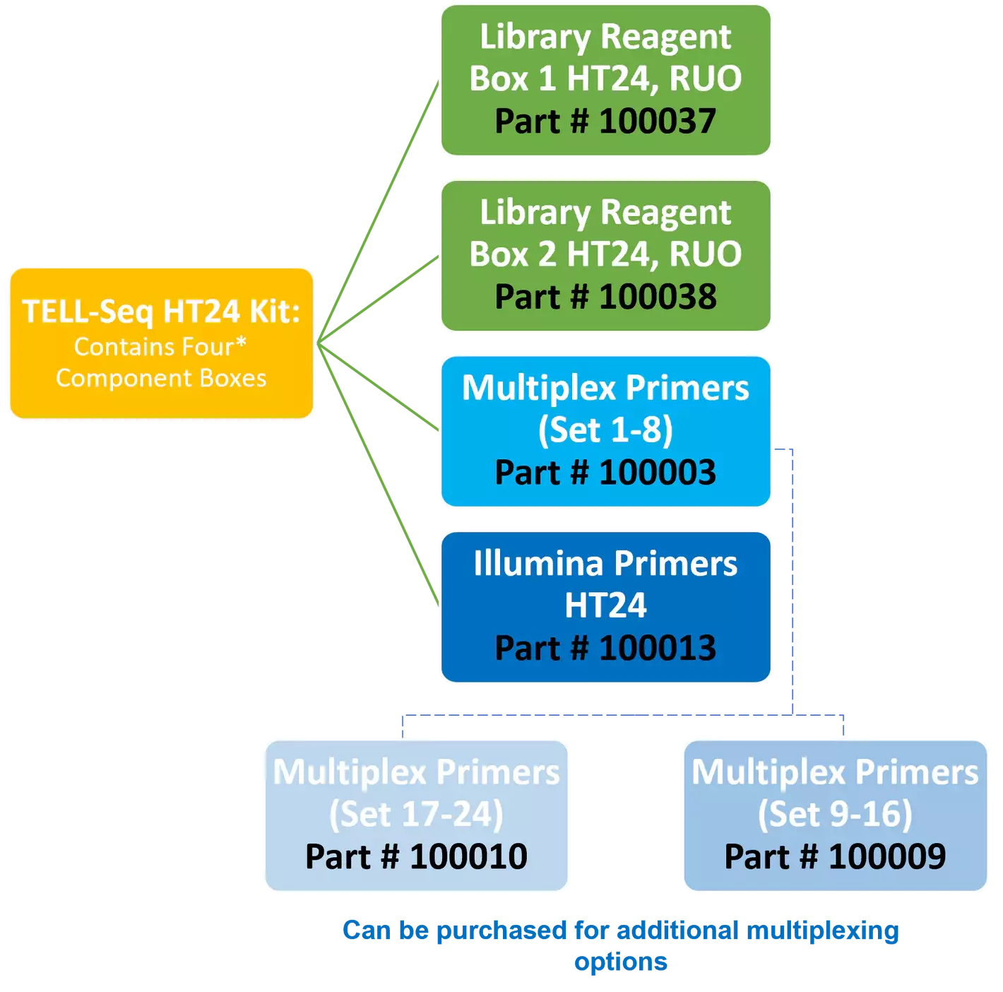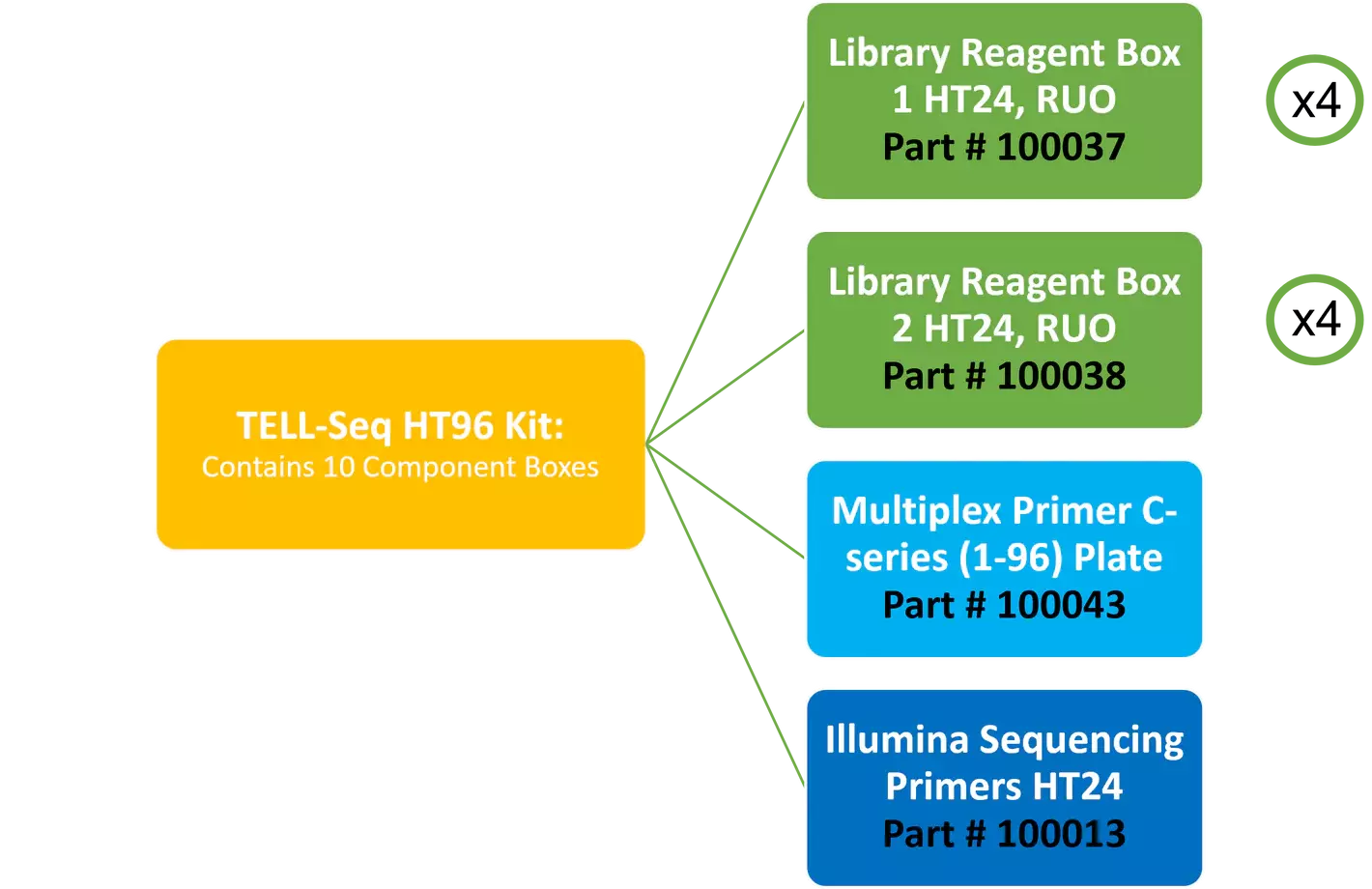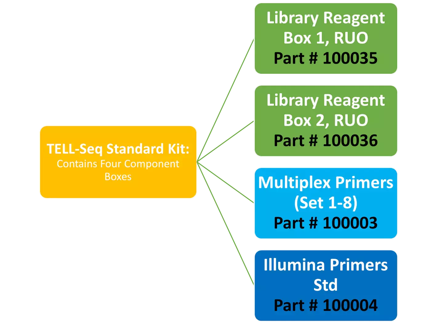 A set of Standard TELL-Seq kit enables you to prepare as many as 12 small genome libraries or 4 large genome libraries. The standard kit includes the following: