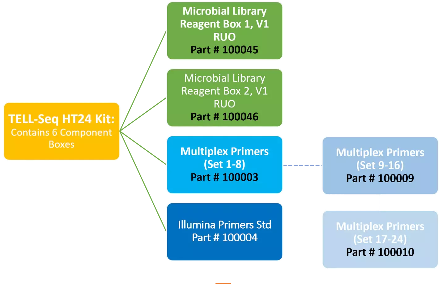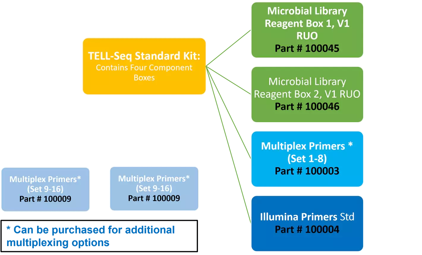 Microbial kits consisting of library preparation kit box 1 (Std), box 2 (Std), Illumina Sequencing primer (Std), and any one of multiplexing primer set 1-8 (or 9-16 or 17-24)